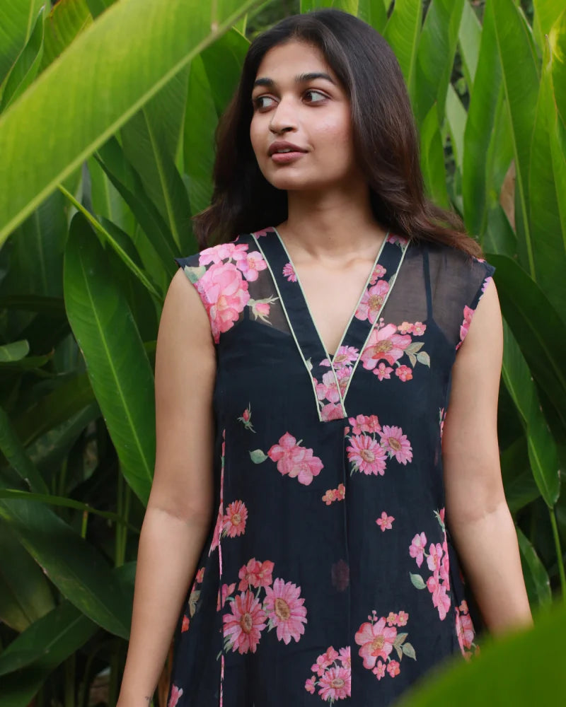 The pretty daises and gulaab flower buds printed pure chanderi dress has a flare of 5 meters and comes with a slip inside.