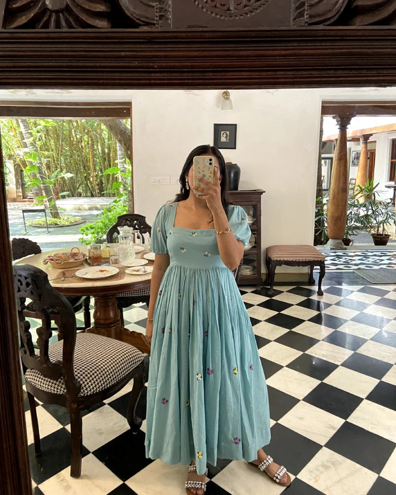 The pure mul cotton Flower Bunch and Chamomile Dress has a great flare and comes with hand embroidery all over the garment and comes with pockets.