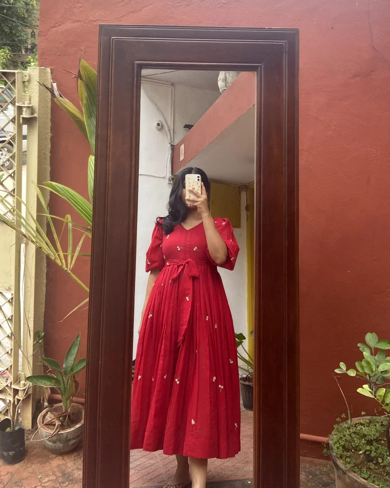 The pure mul cotton Front Tie Up Dress has a great flare and comes with hand embroidery all over the garment and comes with pockets!