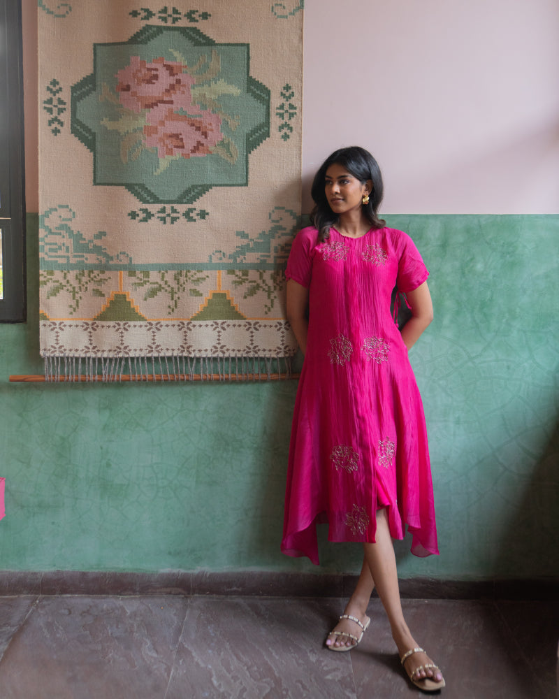 The Gulaabi Pitta hand-embroidered Chanderi dress features a side bias panel and an asymmetrical hemline, and comes with a slip (lining). The sleeves have adjustable drawstrings to loosen or tighten as desired.