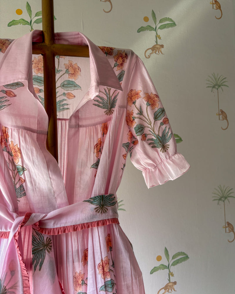Wrap yourself in effortless elegance with our Indira Mul Dress, crafted from the softest Mul cotton for all-day comfort. Adorned with delicate hand-block printed flowers from Jaypore, this dress embodies timeless craftsmanship and charm. Designed for versatility, it features a relaxed silhouette with a detachable belt, allowing you to switch between a free-flowing or cinched fit. Perfect for breezy day! This dress is a celebration of comfort and artistry.