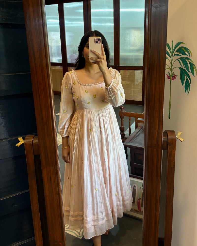 A timeless piece crafted in pure Chanderi, this dress features delicate hand-embroidered Firangi Pani blooms scattered across a serene pale pink canvas. Designed with soft gathers around the neckline for an effortless flow, it offers both charm and comfort, complete with two concealed pockets. Perfect for sunlit days and leisurely evenings.